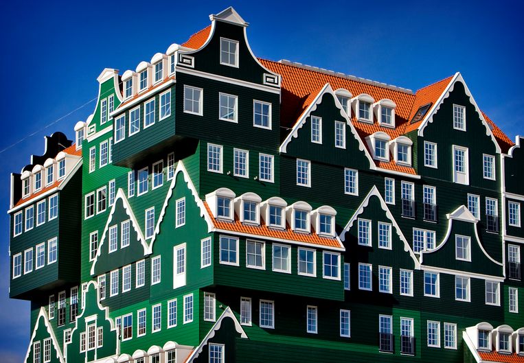 Hotel Zaandam Zaanse Huisjes. Deze bestaat uit wel zeventig opeengestapelde Zaanse huisjes! Het nieuwe Inntel is nog niet opgeleverd, maar nu al de blikvanger van Zaandam.